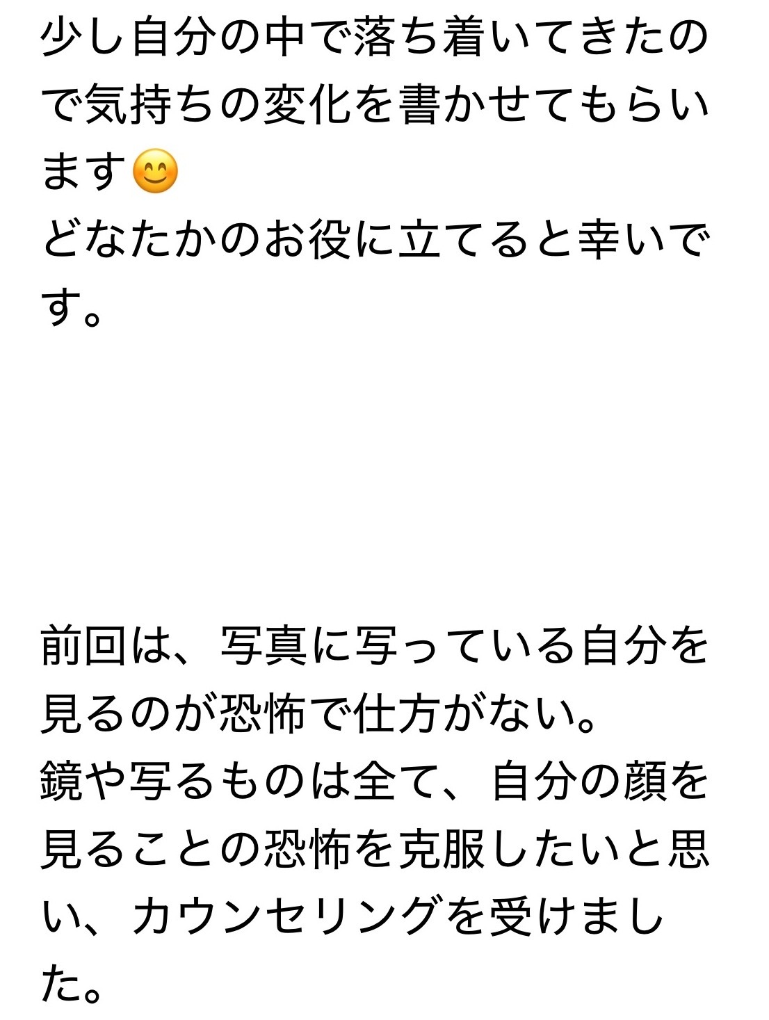 良かったら「今現在悩んでいる方の励みになるので、今回の心理セッションでどのような変化を感じるようになったか?」のご感想をいただけますか?と、お願いしていて快諾いただきました。